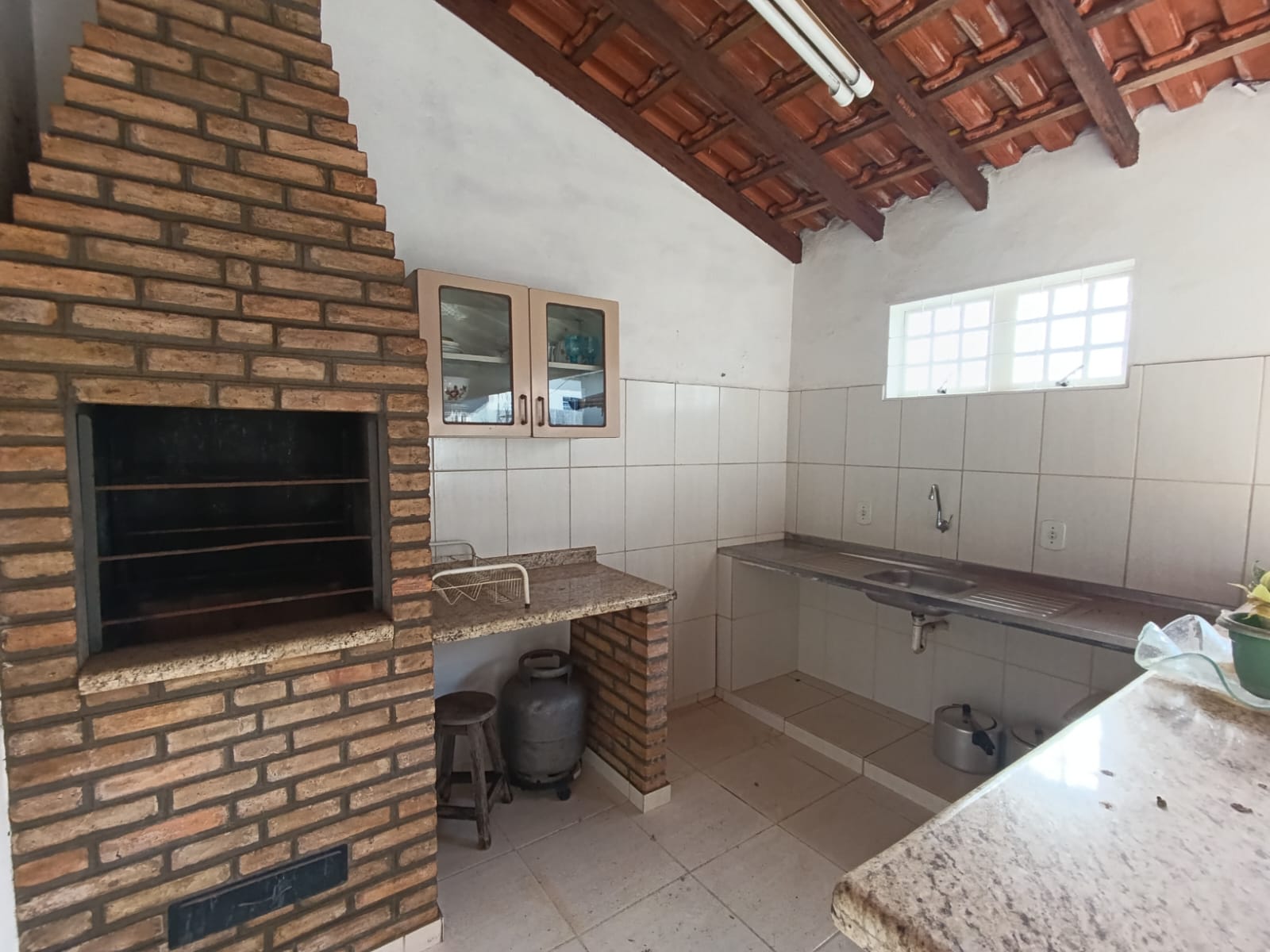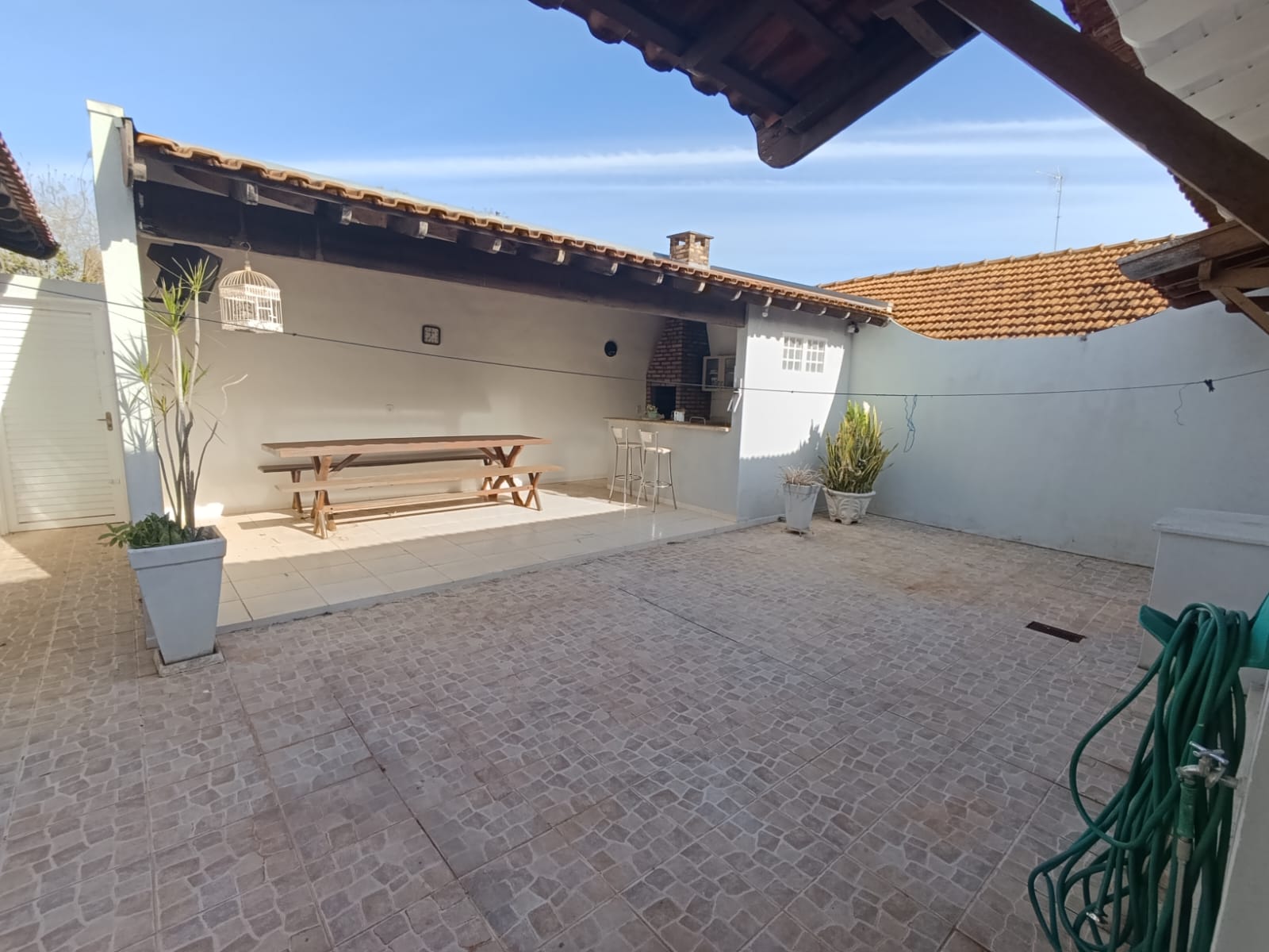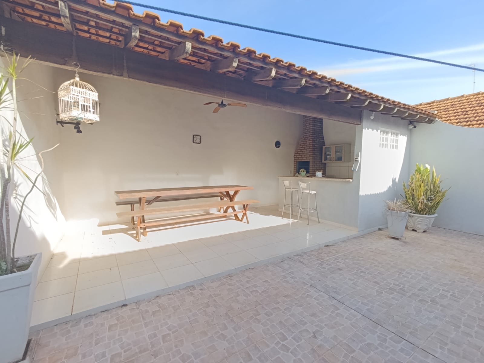 Na área externa ladrilhada , possui varanda com churrasqueira, banheiro e lavanderia.
